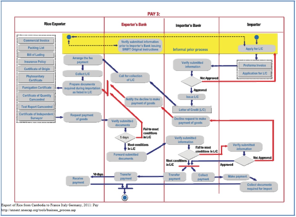 1. At present, the Cambodian export community as a whole suffers from the lack of trade finance / export credit, on two different aspects: first, from the low levels of trade finance provision due to the inexistence of domestic Exim Bank or other guarantee facilities as can be found in some other countries; and second, from what is available from domestic commercial banks, the terms and conditionalities are hard for Cambodian exporters/importers to obtain.86 Thus the current practice of TT transfer for rice trade. 2. Cambodia export market is 100% FOB and even late orders exported by airfreight on factories account will be executed by the nominated FOB-forwarder, with very little exception from this rule. The exporter pays the cost of export packing, the cost of delivering the goods to the carrier which will transport the goods to port and the loading charge. INCOTERMS are internationally accepted terms used to define exactly at what point costs, responsibilities and risks are transferred from the seller to the buyer during the transfer of goods from their source to their destination. 3. Before the payments are made the exporter has to send in the following documents pursuant to the Purchasing Order: “Contract terms:88DOCUMENTS TO BE PRESENTED: a. Original commercial invoice in triplicate. b. Full set of “clean on board” Bills of Ladings, issued to order, blank endorsed, marked “freight prepaid”. c. Certificates of origin (GSP Form “A”) issued in Cambodia. If the GSP form A certificate is issued after B/L date it must bear in box No. 4 the mention “issued retrospectively”. d. Weight certificate issued by CAMCONTROL, countersigned by ISC *. e. Quality certificate issued by CAMCONTROL, countersigned by ISC,* showing exact specification of rice and stating that the rice is milled from non-GMO paddy. f. Original Phytosanitary certificate, issued in Cambodian by competent authorities. g. Fumigation certificate issued by the competent authority stating that fumigation has been done with Phostoxine (Aluminium Phosphine). h. Sellers’ weight & quality certificate issued in the style agreed between sellers and buyers. Original documents to be delivered by first-rate courier service (with tracking possibility) to buyers’ address promptly after receipt of full payment. (for each lot separately).” 4. Letter of Credit requirements: Shipments under Letter of Credit require special documentary care for the Letter of Credit will stipulate method, timing of shipment, documentary requirements as well as the deadline for negotiation. The forwarder can advise the vessel or service, which meets the required shipment and negotiation dates. 5. The benefit of a letter of Credit is that cash is made available through a bank in the country of export and thus payment may be obtained locally by the seller against production of specified documents evidencing shipment. Normally a Letter of Credit is instructed by a buyer through his local bank and that bank's overseas representative called “Correspondent Bank" will advise the seller/beneficiary of the terms in writing. Letter of Credit terms must be strictly adhered to in all detail since payment will not be effected unless the documents presented correspond precisely to the requirements of the Letter of Credit. However, this being so, payment is immediate provided the credit is still current, i.e. unexpired as to date. 6. When attending to a Letter of Credit shipment, forwarders ask the exporter for a copy of the document in order to ensure that its terms are completely observed. The forwarder responsible for the shipping documents needs the fullest details of Letter of Credit conditions by far the best method is to supply a further copy of the document to support shipping instructions.