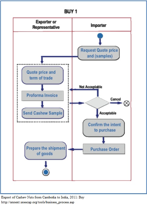 1. We start the BPA map through getting order as the first contact between exporter and importer. The steps of getting order are as follows: 2. The Importer in India shows interest in import of cashew from Cambodia. In the case of a new buyer, the exporter first sends the quotations to the Indian importer, after which cashew samples are usually sent by overnight courier. However, in the case of a regular client, the exporter quotes prices and terms of trade to the buyer via e-mail. 3. The Indian importer verifies the quotation and, assuming the payment terms are acceptable to both parties, confirms the intent to purchase. Then a Purchase Order (PO) is sent by the importer/buyer to the exporter/seller by email or by fax. The exporter/seller raises a Proforma Invoice (PI) or a Purchase Contract against the PO and send it by email or by fax back to the importer/buyer who is required to countersign and stamp as a token of acceptance. (See Annex 1: Purchase Contract). 4. Both parties sign contract which determined the shipping date and commercial terms and conditions. 5. The Cambodian exporter prepares the shipment for export.
