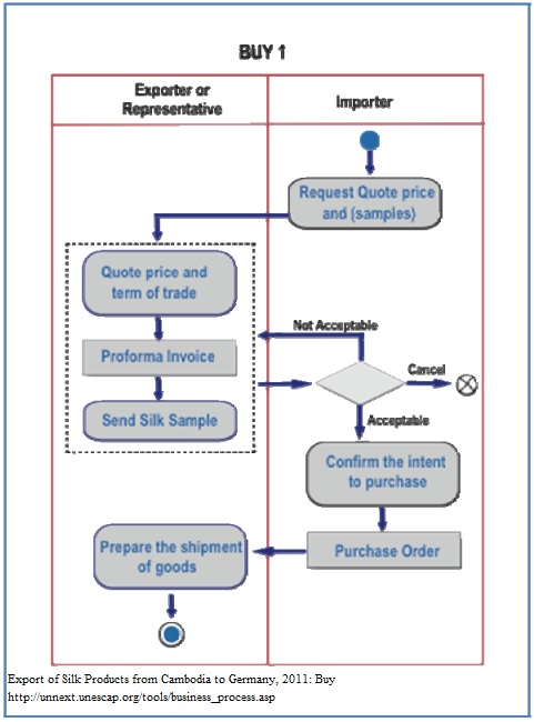 1. Silk purchase is quite a niche approach. Many buyers usually have to have deal with numerous individual enterprises all of whom are different: in scale, in design – some more traditional, some more contemporary, some only dealing in silk products and some with other products - therefore each has to adopt a different approach to their production and marketing. There is no single right way to proceed. The Handmade Textile Association maintains a web shop aimed at international retail and wholesale customers looking for medium-sized quantities. For larger orders of 400 items and up or for custom design orders, the buyers would normally consult with the organization on the custom-made design using different yarn, patterns and colours. 2. We start the BPA map through getting order as the first contact between exporter and importer. The steps of getting order are as follows: 3. The importer in Europe shows interest in import of silk products from Cambodia through the web catalog. For an existing buyer, the importer first sends the request for quotation to the Cambodian exporter, indicating the items in the catalog and the quantity after which the exporter quotes prices and terms of trade to the buyer via e-mail. 4. The importer verifies the quotation and, assuming the payment terms are acceptable to both parties, confirms the intent to purchase. Then a Purchase Order (PO) is sent by the importer/buyer to the exporter/seller by email or by fax. The exporter/seller raises a Proforma Invoice (PI) or a Purchase Contract against the PO and send it by email or by fax back to the importer/buyer who is required to countersign and stamp as a token of acceptance. Normally the Purchase Contract is quite simplistic, with inclusion of only necessary terms and conditions. 5. Both parties sign contract which determined the shipping date and commercial terms and conditions, specifically: a. Contract terms: Information on the Goods – Items No, Fabrication: 100% silk, Quantity and unit price, and tariff line number. b. Destination: From Phnom Penh International Airport, Cambodia to Hannover Airport (HAJ) Germany. c. Other terms and specific conditions: In case of dispute, both parties shall settle by amicable negotiation. 6. The Cambodian exporter prepares the shipment for export.