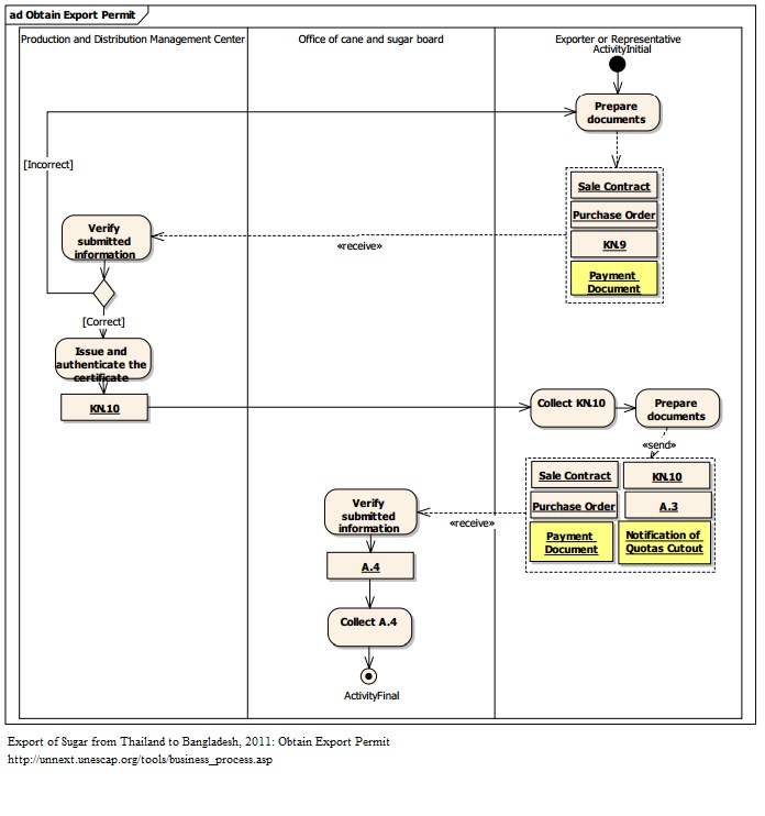 1An exporter prepares documents required for the application of Permit for the Export of Sugar. These documents include: - Sale Contract - Purchase Order - Application for Permission to Export Sugar (KN.9) - Payment Document 2 An officer at Production and Distribution Management Center reviews and verifies submitted information. 3 If the submitted information is correct, an authorized officer signs and authenticates Permit for the Export of Sugar (KN. 10). 4 An exporter receives a Permit for the Export of Sugar (KN. 10). 5 Exporter prepares documents required for the application of Permit for the Export of Goods. These documents include: o Sale Contract o Purchase Order o Payment Document o Notification of Quotas Cutout o Permit for the Export of Sugar (KN. 10). o Application for the Export of Goods (A.3) 6 An officer at Office of cane and sugar board reviews and verifies submitted information and authenticates Permit for the Export of Goods (A.4). 7 An officer at Office of cane and sugar board collect the Permit for the Export of Goods (A.4).