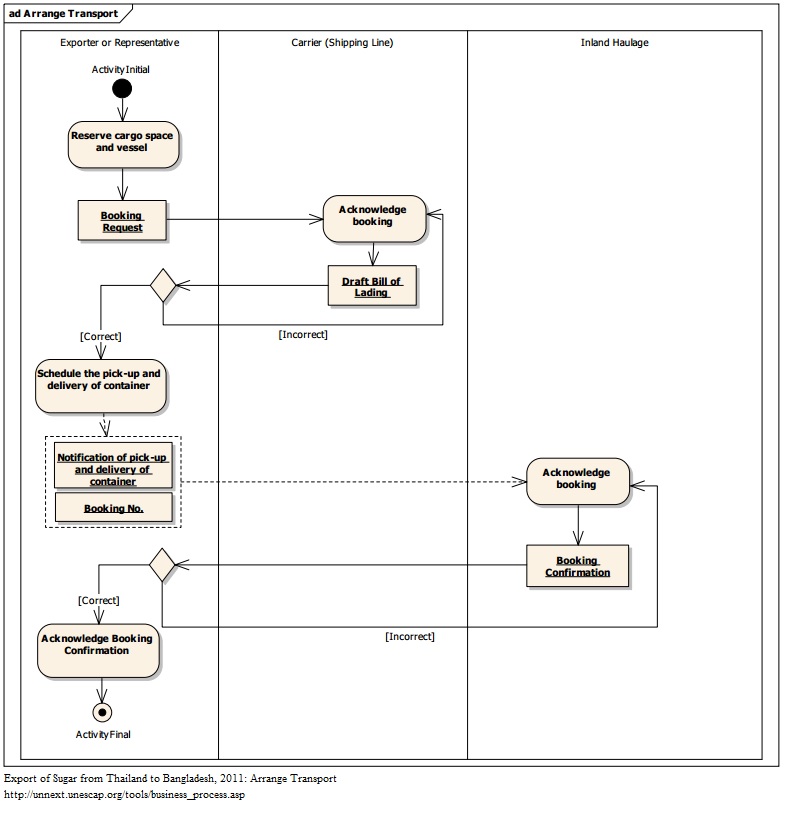 1 An exporter or representative contacts a carrier (shipping line) to reserve cargo space and vessel. Booking request can be prepared in various forms depending on the shipping line. For some shipping lines, a booking of cargo space and vessel can be done through online reservation system. For those that do not have such system, the booking is done over the phone or email. 2 A carrier acknowledges the booking request by returning a draft Bill of Lading to an exporter or representative. The draft Bill of Lading shall be revised until an exporter or representative acknowledges its correctness. 3 If the information in the draft Bill of Lading is correct, an exporter or representative contact an inland haulage to schedule a pick-up of an empty container from carrier’s container yard, a delivery of that empty container to exporter’s warehouse, and a return of stuffed container to container yard for further loading. At this stage, the booking request is often done over phone, fax, and email. 4 Inland haulage acknowledges the booking request by returning a booking confirmation to an exporter or representative. The booking confirmation shall be revised until an exporter or representative acknowledges its correctness.