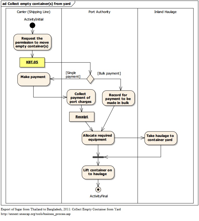 1. A driver takes the haulage to the specified container yard to pick up an empty container. 2. A carrier submits Empty Container Movement Request (KBT.05) to ask for the permission to transfer an empty container to exporter’s premise. 3. If a carrier wishes to make an upfront payment, an officer at Port Authority collects associated port charges and issues a receipt upon a receipt of charges. If a carrier has already made an arrangement with Port Authority for a bulk payment, an officer at Port Authority records the amount to be paid. 4. An officer at Port Authority then allocates necessary equipment and lifts an empty container on to haulage