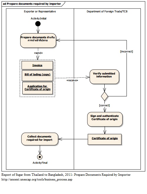 1 An exporter or representative prepares documents necessary for the application of Certificates used in import formalities.These documents include: - Invoice - Bill of Lading (B/L) - Application for Certificate of Origin 2 An officer at Department of Foreign Trade reviews and verifies submitted information. 3 If the submitted information is correct, an authorized officer signs and authenticates Permit for the Certificate of Origin. 4 An exporter collect documents required for import.
