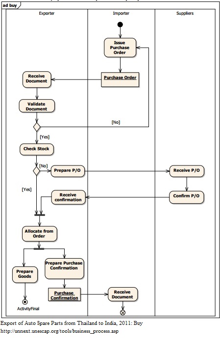 1. Importer issues purchase order to Exporter 2. Exporter validates purchase order document. If it’s not correct, Exporter will return document back to Importer. If it’s correct, Exporter will continue to the next step. 3. Exporter checks the stock. If it doesn’t exist, Exporter will create P/O documents for suppliers. Suppliers receive P/O documents and reply the confirmation back to Exporter. 4. Exporter allocates products from orders. 5. Exporter prepares purchase confirmation and reply to Importer. 6. Exporter continues products/goods preparation in the next step.